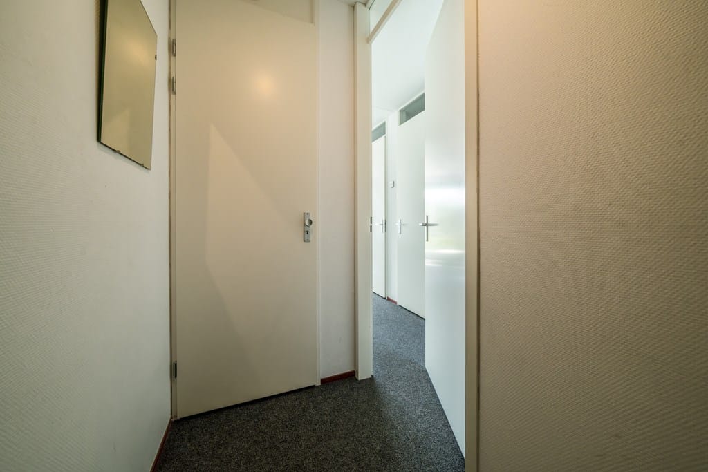 Via de galerij aan de achterzijde kom je bij jouw voordeur. Eenmaal binnen stap je in jouw eigen plek: een efficiënt ingedeeld appartement van ruim 35m² met een fijne flow. De woonkamer heeft grote ramen over de volle breedte — zonlicht all day. De open keuken is voorzien van inbouwapparatuur, en slim geïntegreerd in de leefruimte. Vanuit de zithoek kijk je uit over de groene straat of het gezamenlijke binnenterrein. De slaapkamer ligt beschut aan de achterzijde en is verrassend ruim. In de badkamer vind je een douche, wastafel en toilet — fris, neutraal en klaar voor dagelijks comfort.