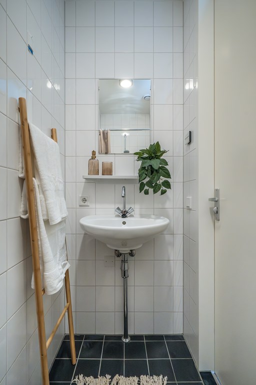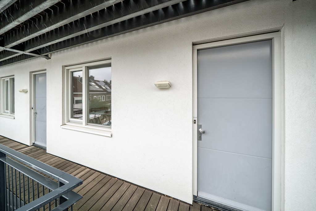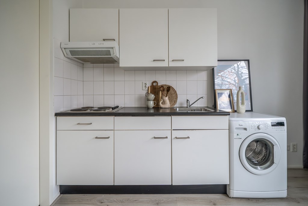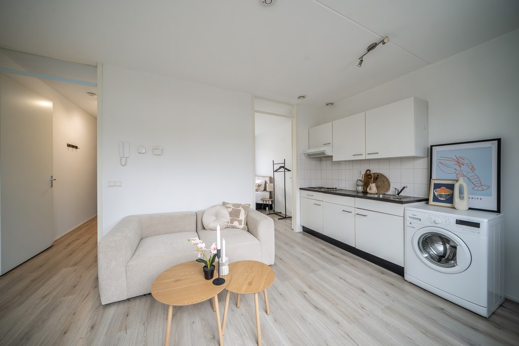 Via de galerij aan de achterzijde kom je bij jouw voordeur. Eenmaal binnen stap je in jouw eigen plek: een efficiënt ingedeeld appartement van ruim 34m² met een fijne flow. De woonkamer heeft grote ramen over de volle breedte — zonlicht all day. De open keuken is voorzien van inbouwapparatuur, en slim geïntegreerd in de leefruimte. Vanuit de zithoek kijk je uit over de groene straat of het gezamenlijke binnenterrein. De slaapkamer ligt beschut aan de achterzijde en is verrassend ruim. In de badkamer vind je een douche en wastafel — fris, neutraal en klaar voor dagelijks comfort. Separaat toilet.
