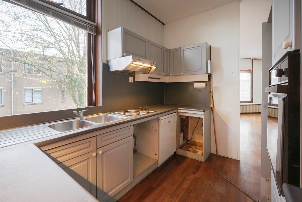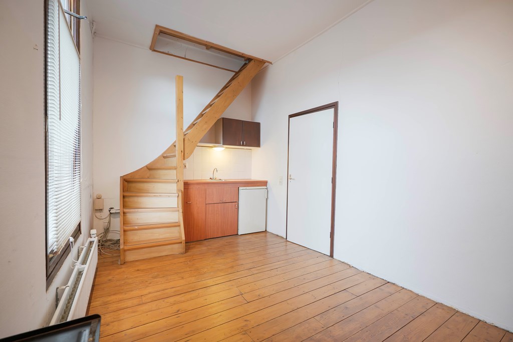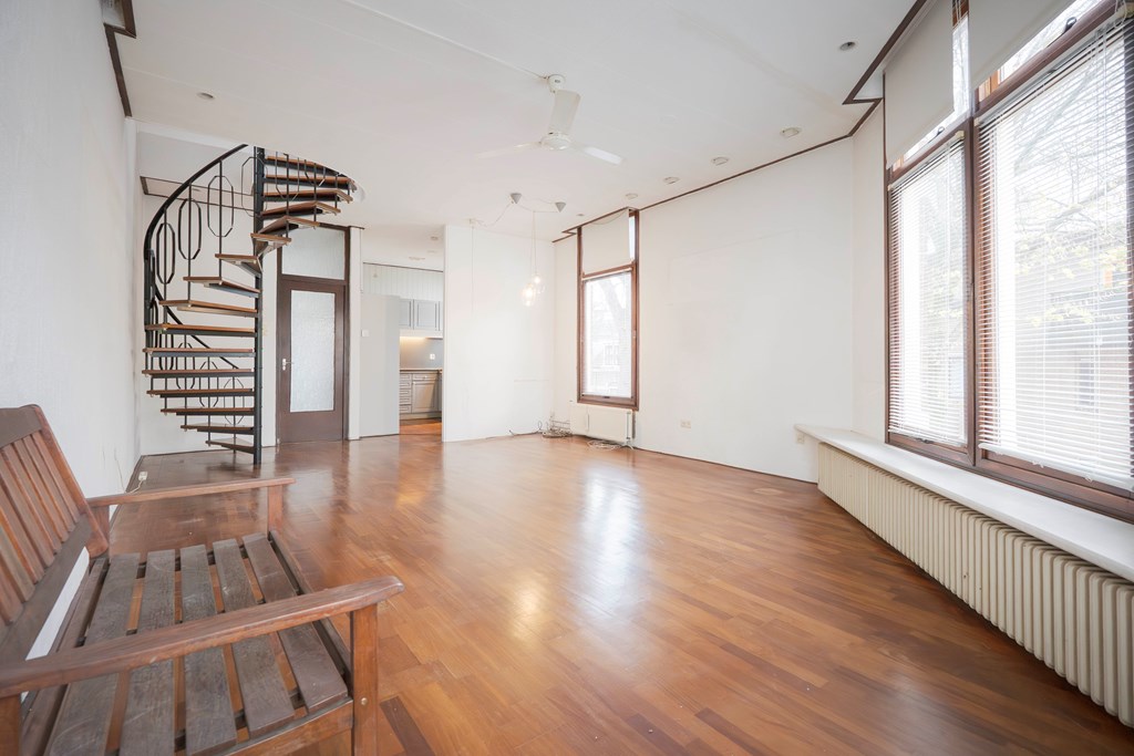 Op de eerste verdieping kom je via de overloop in de woonkamer aan de voorzijde. De brede raampartij zorgt voor licht van ’s morgens vroeg tot in de middag en de houten vloer geeft de ruimte karakter. De keuken ligt centraal in de woning en is compact maar functioneel met voldoende opstellingsruimte. Aan de achterzijde bevindt zich een tweede woonkamer met een klein keukentje: ideaal voor dubbele bewoning, werken aan huis, een atelier of gewoon een extra leefruimte. Vanuit de hal stap je het balkon op, waar je boven de binnentuinen uitkijkt. Op deze verdieping vind je ook een separaat toilet.