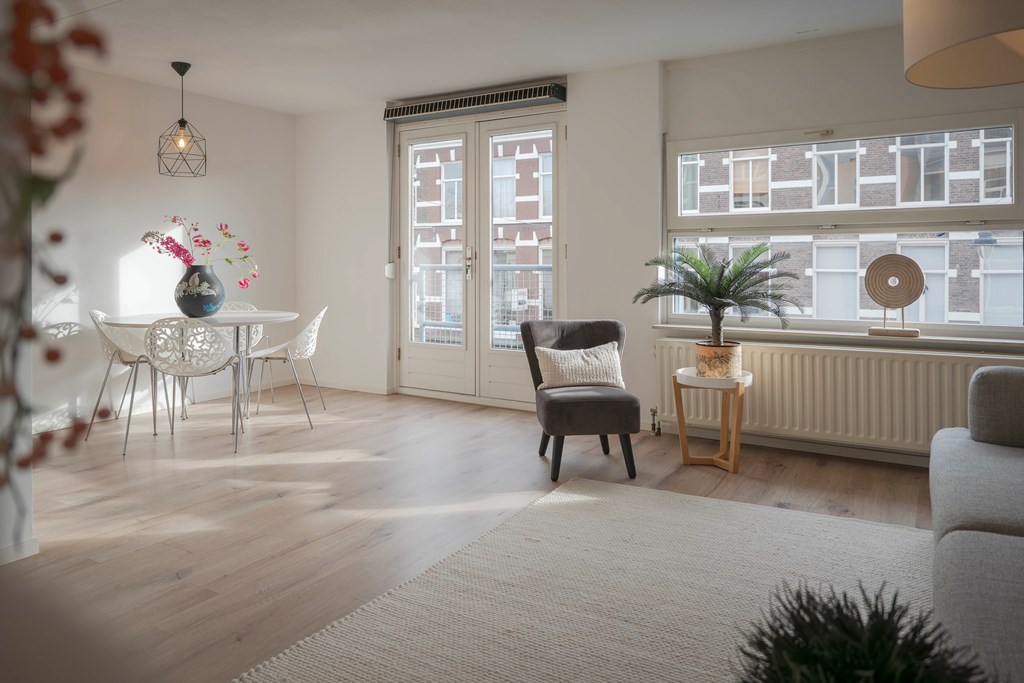 Via de hal kom je binnen in het appartement. Direct valt op hoe logisch de ruimtes met elkaar verbonden zijn. Het separate toilet bevindt zich aan de hal, praktisch en netjes weggewerkt. Vanuit de woonkamer open je de openslaande deuren en laat je op een mooie dag de stad letterlijk naar binnen stromen – frisse lucht, levendigheid en een fijne connectie met buiten. De woonkamer loopt vloeiend over in de eetkamer, waardoor je één royale leefruimte ervaart. Hier kun je een mooie eettafel kwijt zonder dat het ten koste gaat van je zithoek. De eetkamer gaat vervolgens over in de keuken, die praktisch is ingericht en voorzien van inbouwapparatuur. Alles binnen handbereik, zonder dat het benauwd aanvoelt.